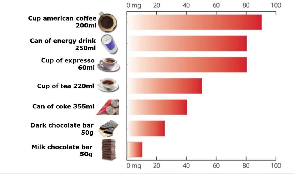La tabella di seguito indica il contenuto standard in mg di caffeina delle preparazioni di caffetteria e degli alimenti solidi e liquidi che ne contengono una quantità sensibile