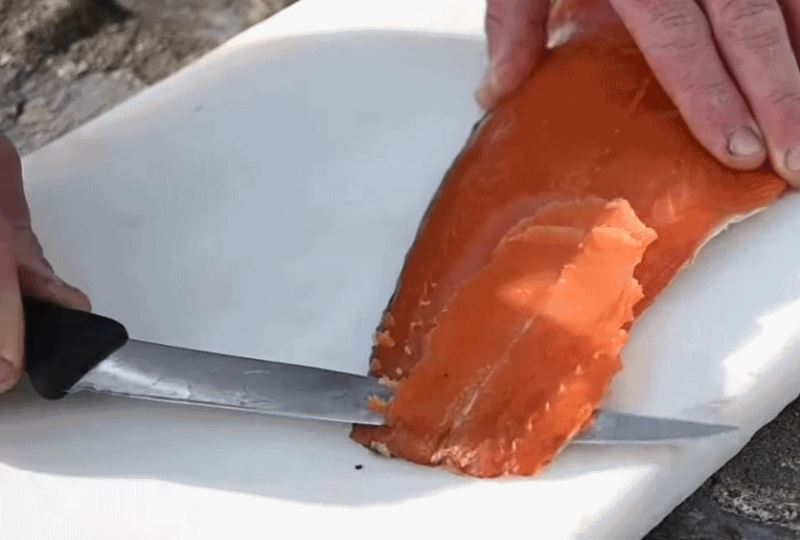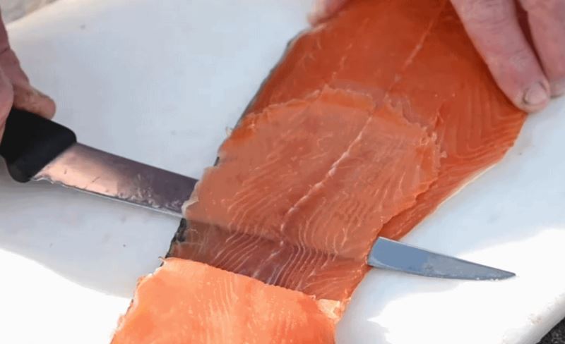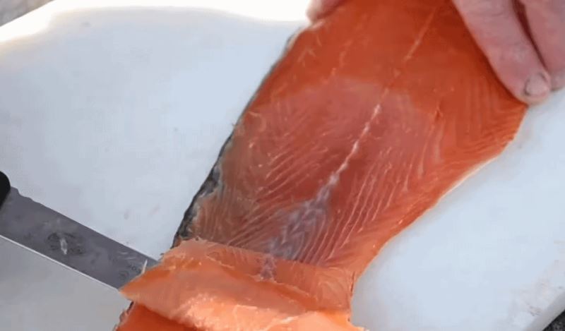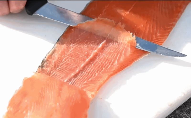 Il salmone affumicato si taglia con un coltello ben affilato, tenuto quasi piatto e verso la coda.